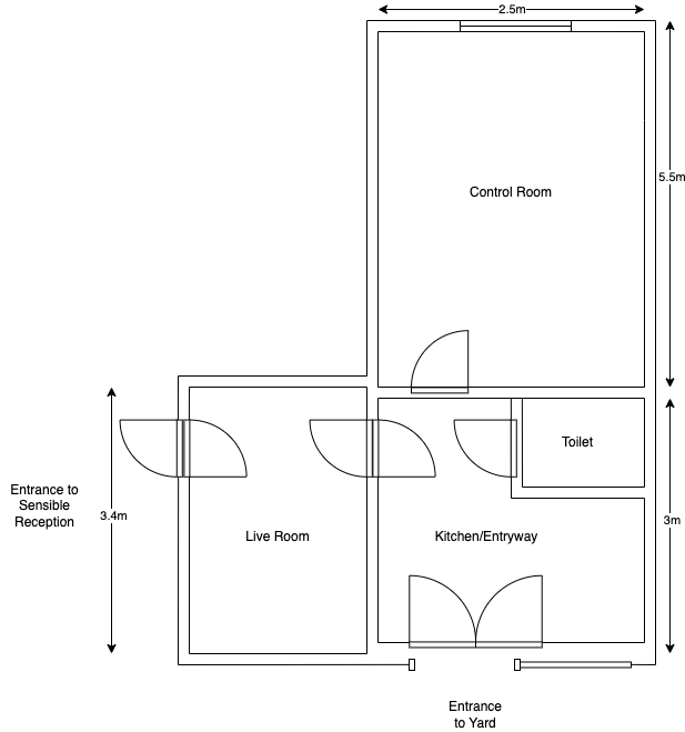 Control Room: 2.5m wide by 5.5m long. Booth: 3.4m wide by 2.2m long. Kitchen/Lobby/Bathroom: 2.6m wide by 3.0m long.