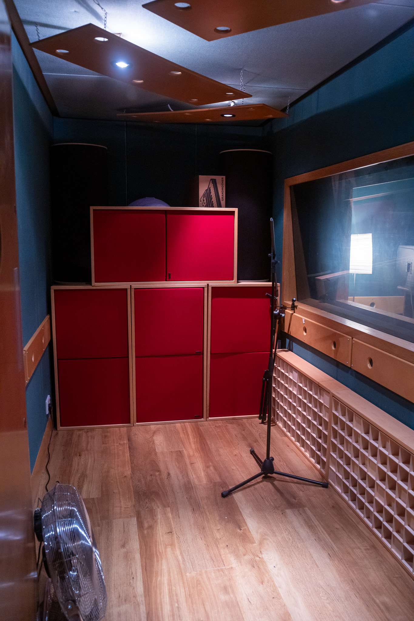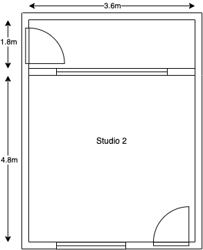 Measurements: 3.6m wide by 4.8m long. Vocal booth: 3.6m wide by 1.8m long.